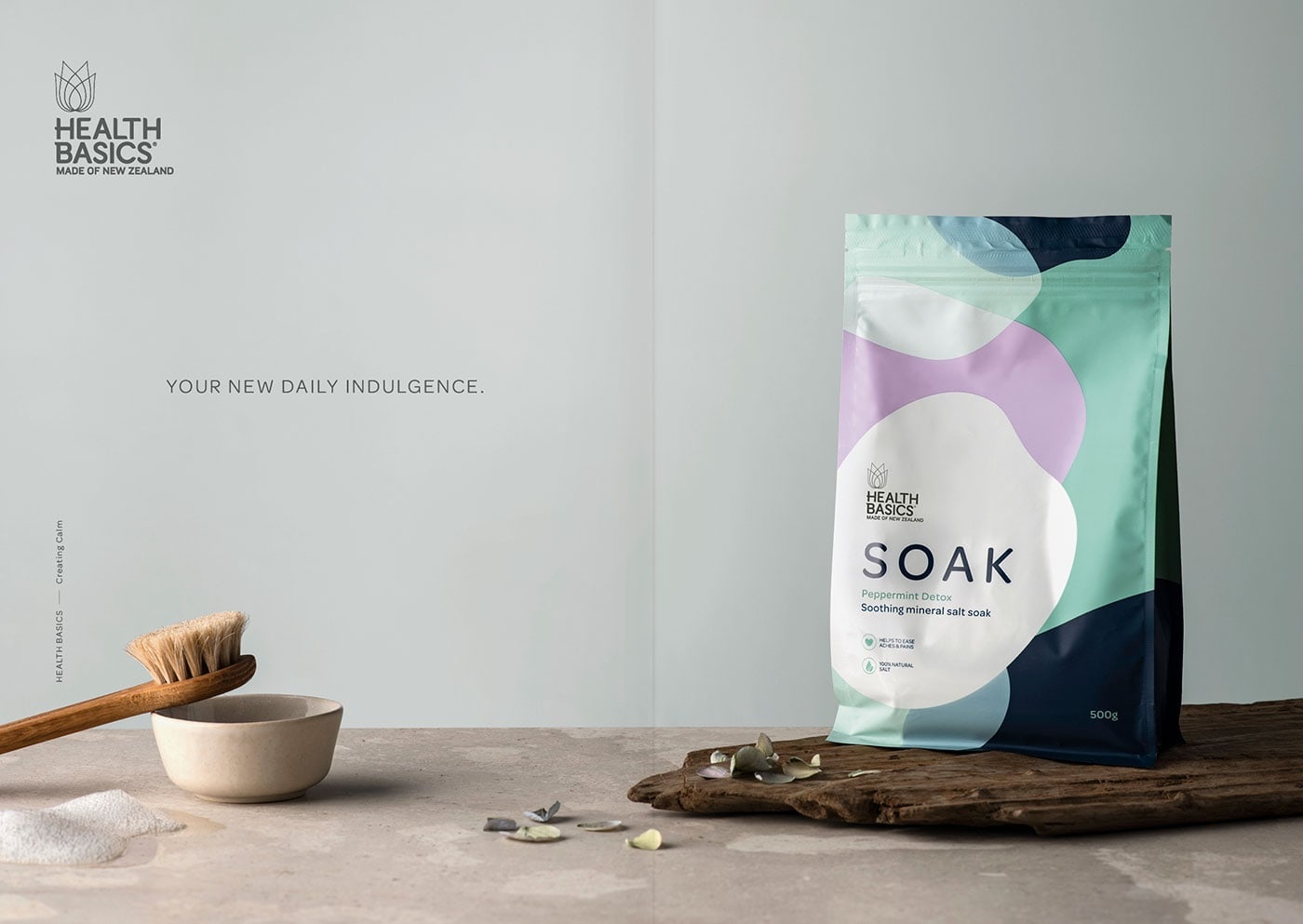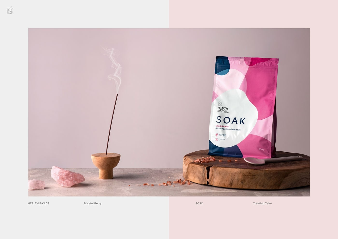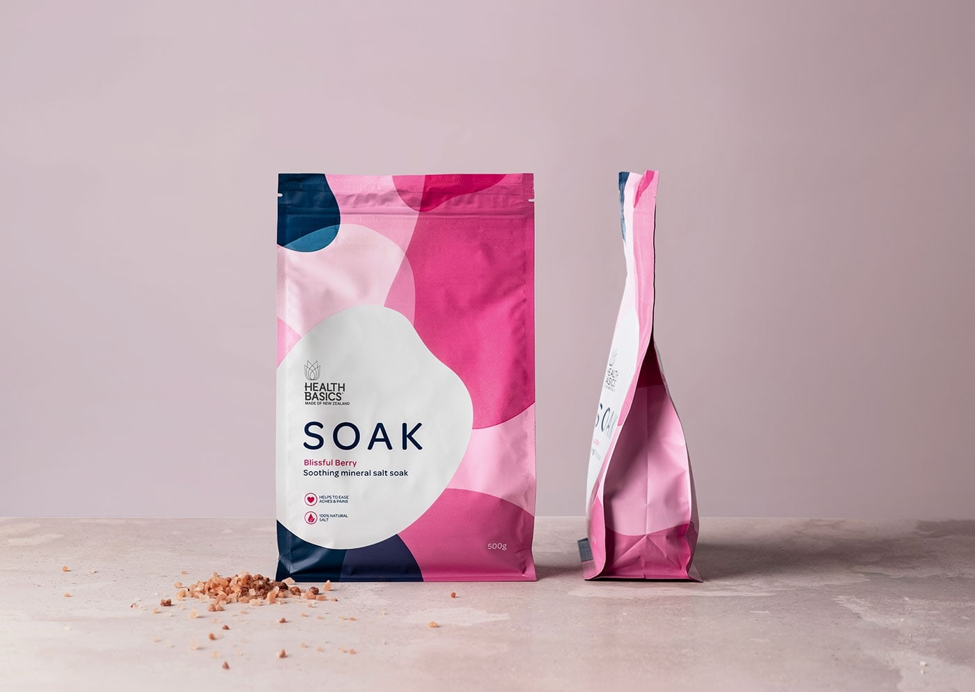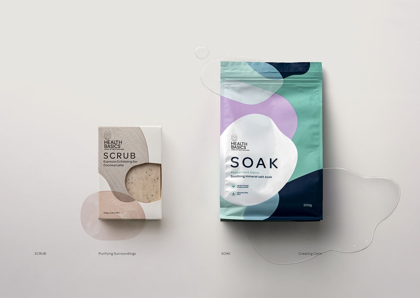 包装设计公司设计了健康基础盐“浸泡” -舒缓矿物盐品牌。Health Basics希望在其产品系列中引入两种新产品:沐浴露和沐浴盐。如您所料,品牌和直通在这两个类别中都起着举足轻重的作用。